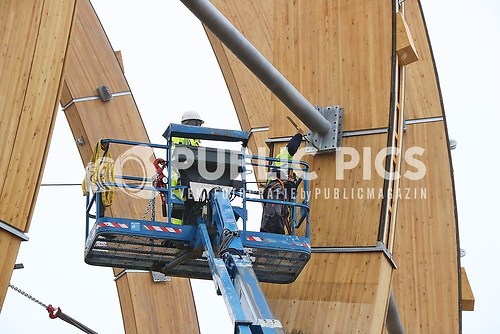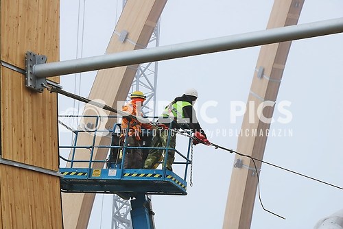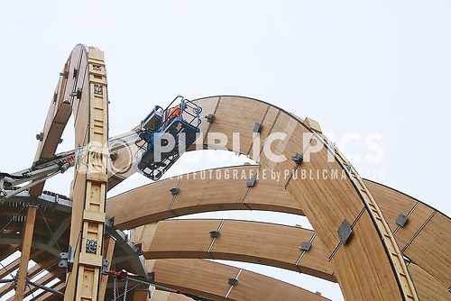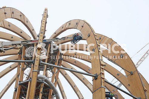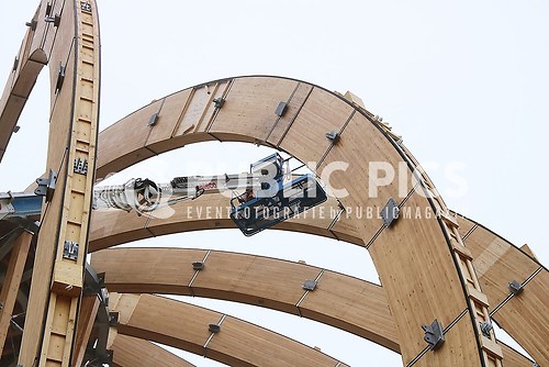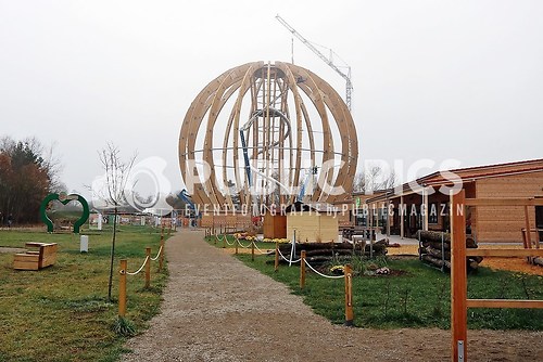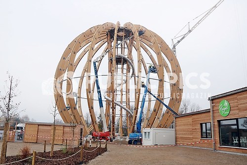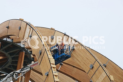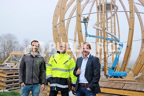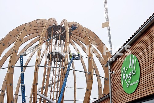 DIE KUGEL IST NUN ENDLICH RUND - Am Samstag den 10.11.2018, wurde der letzte Leimbinder auf der „Kugelbaustelle“ am Steinberger See verbaut und somit ist das Grundgerüst fertiggestellt. Geschäftsführer Kim Kappenberger teilte allen anwesenden Presseleute am heutigen Pressetermin mit, dass kommende Woche das Tragwerk der Erlebnisholzkugel komplettiert wird, in welchem insgesamt: 627m³ Holzbauteile, 190 Tonnen Stahlteile und 660 Stück Zugstangen verarbeitet werden. Die Fa. HESS TIMBER GmbH welche u.a. für die komplette Statik verantwortlich ist und Wolfgang Wild, Chef des Generalunternehmens Almholz Vertriebsgmbh aus der Oststeiermark, bedankten sich für die gute Zusammenarbeit bei dem ersten „Holzturm“ in Kugelform, mit mehr als 30 Spielstationen, 2 Hängebrücken und 600m Laufweg.
